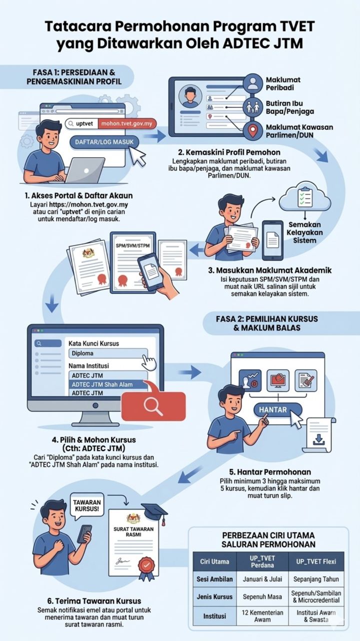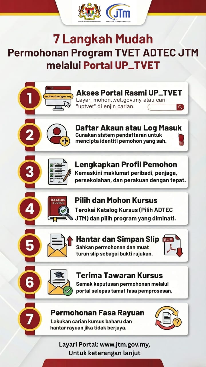 Sila layari portal https://mohon.tvet.gov.my/ untuk permohonan dan ikuti langkah – langkah seperti yang tertera.